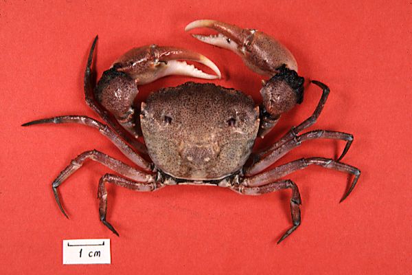 the outerorbital -Surface of carapace marked with small red spots. -Epibranchial regions each with a large and round red spot. -Carapace length: (M) 19.1 mm, (F) 22.2 mm; breath: (M)