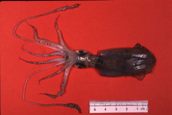 broad paddle- -Head large with enormous eyes -Arms with 4 longitudinal rows of suckers -Tentacles long of slender stalks -Size: 30-50mm -Colour: Purplish-brown chromatophores cover the body | |